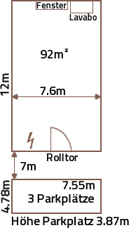Grösse des Platzes: Länge 7.55m x Breite 4.78m x Höhe 3.87m - WC-Anlage im selben Gebäude vorhanden.